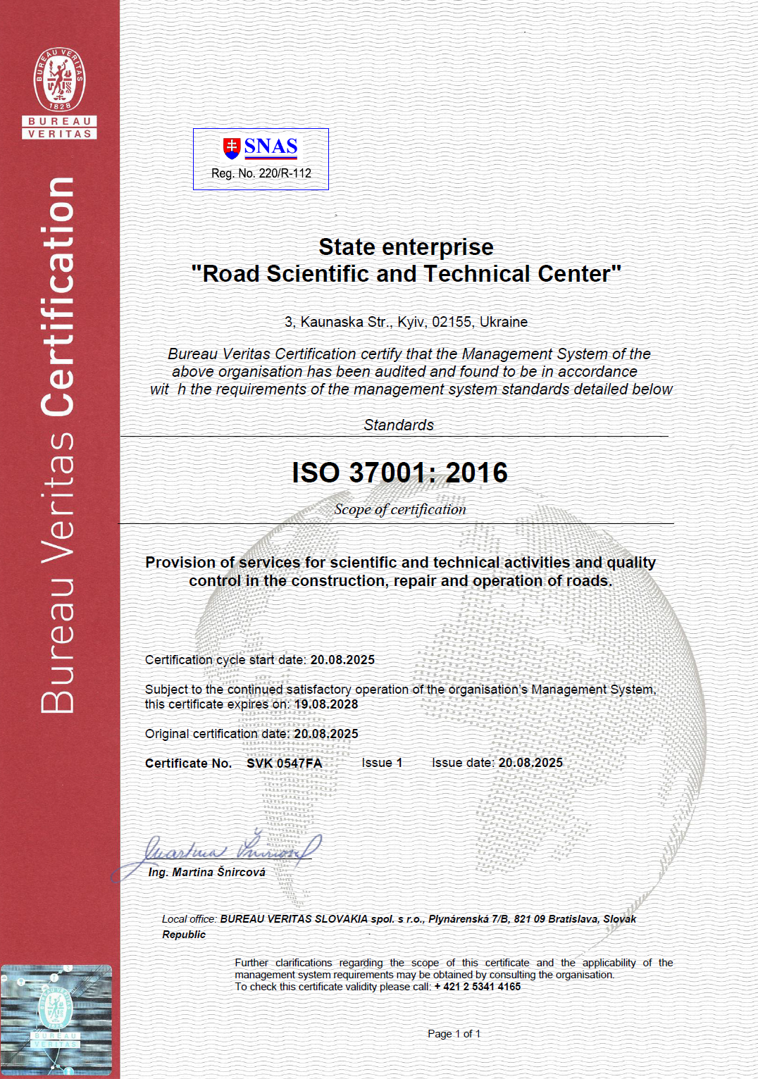Успішно пройшли аудит від Bureau Veritas Certification та отримали міжнародний сертифікат відповідності стандарту ISO 37001 управління протидією корупції